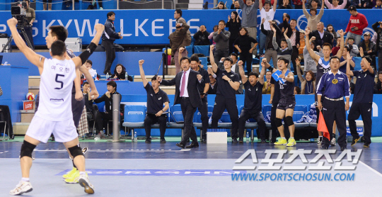 이날 승리의 일등공신은 42점을 쏟아부은 아가메즈였다. 김 감독은 "아가메즈가 터키에서 뛰면서 지금처럼 많이 때리지는 않았을 것"이라며 "체력적인 부분에서 떨어지는 것은 사실이다"고 평가했다. 14점을 한 송준호에 대해서도 "KOVO컵이 끝난 뒤 선수로서 길을 잃었다"면서 "선배들과 함께 생활하면서 포지션에 대한 부분들을 풀고 나니까 좋은 모습을 보이게 됐다"고 말했다.