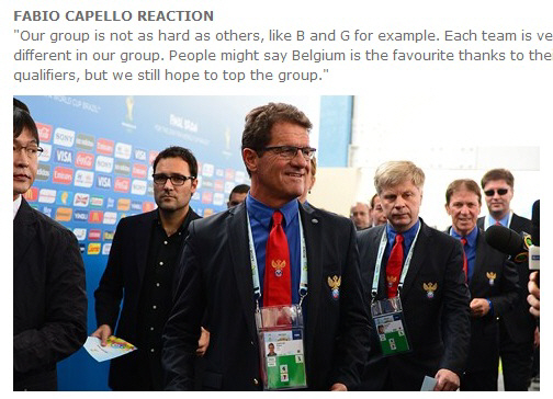 알베르토 자케로니 일본 대표팀 감독의 조언이 카펠로 감독을 깨웠다. 카펠로 감독은 10일(한국시각) 러시아 일간지 스포츠익스프레스와의 인터뷰에서 "친구인 자케로니 감독이 한국을 아주 조심해야 한다는 조언을 해줬다"며 "한국은 매우 심각하게 바라봐야 할 상대다. 전력을 철저하게 분석하겠다"고 말했다. 본선 조추첨 직후 한국에 대해 특별한 언급 없이 만족스럽다는 말을 했던 것과는 대조적이다.