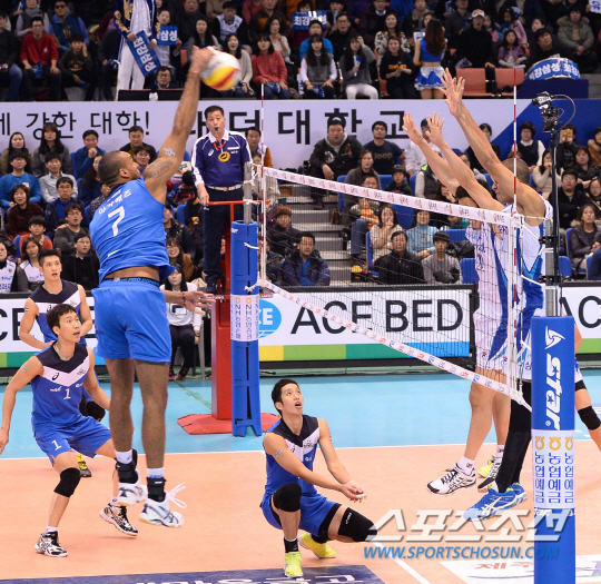 2013-2014 프로배구 V리그 3라운드 삼성화재와 현대캐피탈의 경기가 5일 대전충무체육관에서 열렸다. 현대캐피탈 아가메즈가 삼성화재 레오의 블로킹 사이로 스파이크를 강타하고 있다. 대전=최문영 기자 deer@sportschosun.com /2014.01.05/ |