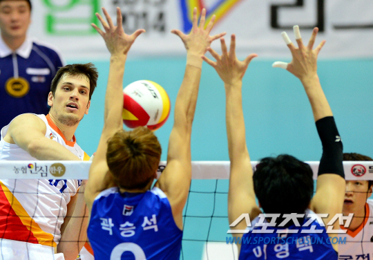21일 수원실내체육관에서 배구v리그 한국전력과 대한항공의 경기가 열렸다. 한국전력 밀로스가 대한항공 곽승석, 이영택의 블로킹을 앞에 두고 스파이크를 날리고 있다. 수원=송정헌 기자 songs@sportschosun.com