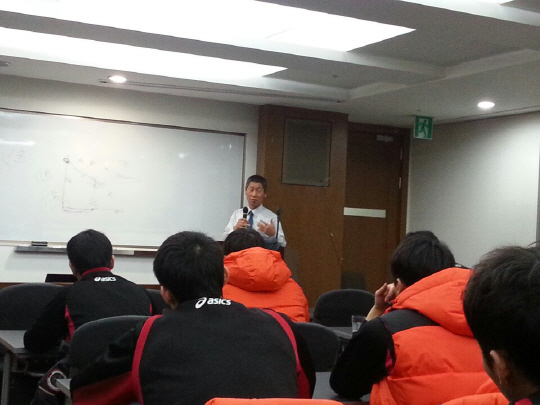 김 감독은 특강 준비를 위해 이번 시즌 LIG손해보험의 경기를 보고 각종 데이터를 꼼꼼하게 분석했다. 김 감독은 특강 시작부터 LIG손해보험 선수단을 강하게 꼬집었다. 김 감독은 "연습을 안하면 극한 상황에 몰려도 아쉬움이 없다. 연습 자체를 남이 못할 정도로 해야 한다"면서 강한 훈련을 요구했다. 특히 " '이것은 무리다' 하는 순간 프로가 아닌것이다. 프로는 상대가 싫어해야 한다. 상대가 우리팀을 좋아하면 안된다. 범실도 개인별로 한 개씩 줄여봐라. 팀이 하나로 뭉치는데에는 스타선수도 수련선수도 다 똑같다" 라며 선수단의 강한 프로 정신을 주문했다.