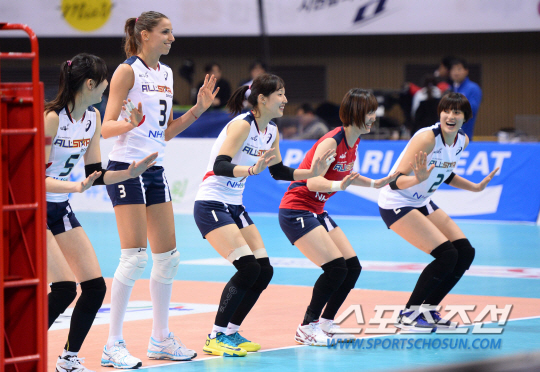 2013-2014 프로배구 V리그 올스타전이 19일 수원실내체육관에서 열렸다. K스타팀 선수들이 공격포인트를 올리고 막춤 세리머니를 펼치고 있다. '스파이크 서브 킹&퀸 콘테스트'에 이어서 열린 경기는 K스타팀(남자부 삼성화재, 현대캐피탈, LIG손해보험, 여자부 IBK기업은행, 현대건설, 흥국생명)과 V스타 팀(남자부 대한항공, 우리카드, 한국전력, 러시앤캐시, 여자부 GS칼텍스, 한국도로공사, KGC인삼공사)으로 나눠 펼쳐졌다. 수원=최문영 기자 deer@sportschosun.com /2014.01.19/