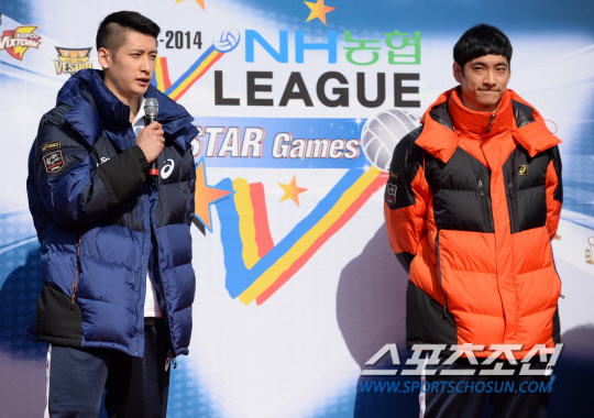 2013-2014 프로배구 올스타전이 19일 수원실내체육관에서 열렸다. 경기 전 펼쳐진 장외이벤트 '소원을 들어주세요!'에서 문성민과 김요한이 팬들에게 인사말을 하고 있다. 프로배구 출범 10주년을 맞이하여 펼쳐진 올스타전은 K스타팀(남자부 삼성화재, 현대캐피탈, LIG손해보험, 여자부 IBK기업은행, 현대건설, 흥국생명)과 V스타 팀(남자부 대한항공, 우리카드, 한국전력, 러시앤캐시, 여자부 GS칼텍스, 한국도로공사, KGC인삼공사)의 대결로 진행된다. 수원=허상욱 기자 wook@sportschosun.com/2014.01.19/