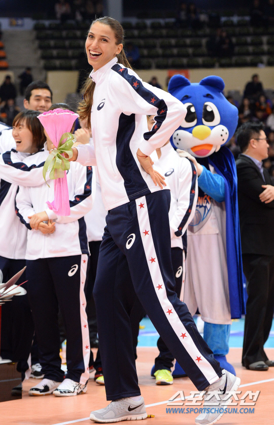 2013-2014 프로배구 V리그 올스타전이 19일 수원실내체육관에서 열렸다. 세리머니 상을 받은 K스타팀 바실레바가 엉덩이춤을 추며 환호하고 있다. '스파이크 서브 킹&퀸 콘테스트'에 이어서 열린 경기는 K스타팀(남자부 삼성화재, 현대캐피탈, LIG손해보험, 여자부 IBK기업은행, 현대건설, 흥국생명)과 V스타 팀(남자부 대한항공, 우리카드, 한국전력, 러시앤캐시, 여자부 GS칼텍스, 한국도로공사, KGC인삼공사)으로 나눠 펼쳐졌다. 수원=최문영 기자 deer@sportschosun.com /2014.01.19/