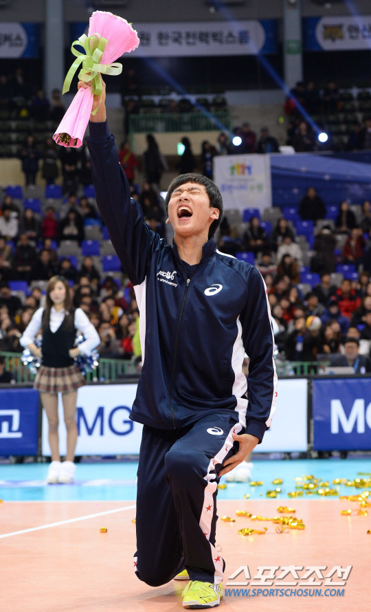 2013-2014 프로배구 V리그 올스타전이 19일 수원실내체육관에서 열렸다. 세리머니 상을 받은 V스타팀 송명근이 환호하고 있다. '스파이크 서브 킹&퀸 콘테스트'에 이어서 열린 경기는 K스타팀(남자부 삼성화재, 현대캐피탈, LIG손해보험, 여자부 IBK기업은행, 현대건설, 흥국생명)과 V스타 팀(남자부 대한항공, 우리카드, 한국전력, 러시앤캐시, 여자부 GS칼텍스, 한국도로공사, KGC인삼공사)으로 나눠 펼쳐졌다. 수원=최문영 기자 deer@sportschosun.com /2014.01.19/