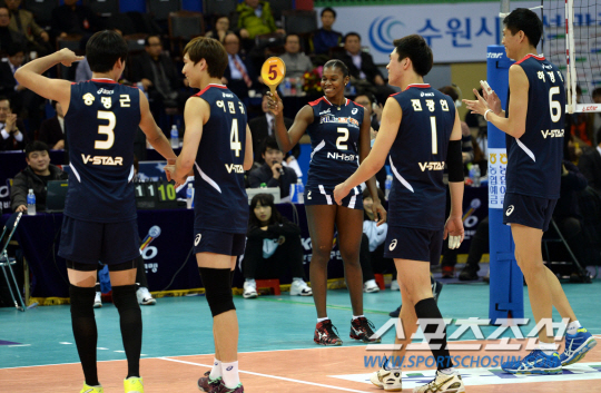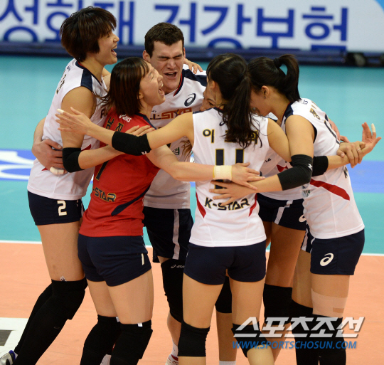 2013-2014 프로배구 올스타전이 19일 수원실내체육관에서 열렸다. 1세트 여자부 경기에 선수교체로 들어선 K스타팀 에드가가 공격을 성공한 후 여자부 선수들과 기쁨을 나누고 있다. 프로배구 출범 10주년을 맞이하여 펼쳐진 올스타전은 K스타팀(남자부 삼성화재, 현대캐피탈, LIG손해보험, 여자부 IBK기업은행, 현대건설, 흥국생명)과 V스타 팀(남자부 대한항공, 우리카드, 한국전력, 러시앤캐시, 여자부 GS칼텍스, 한국도로공사, KGC인삼공사)의 대결로 진행된다. 수원=허상욱 기자 wook@sportschosun.com/2014.01.19/