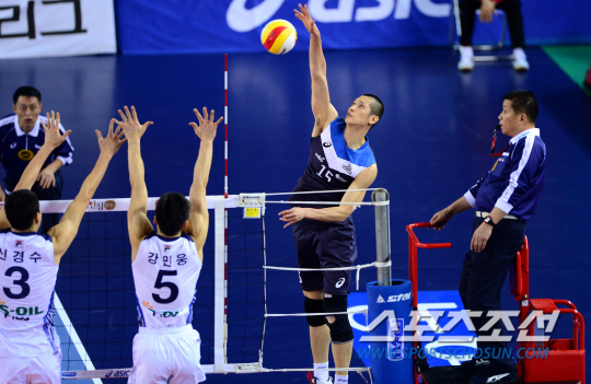 2일 천안 유관순체육관에서 배구 V리그 남자부 현대캐피탈과 대한항공의 경기가 열렸다. 현대캐피탈 문성민이 대한항공 신경수, 강민웅의 블로킹을 앞에 두고 스파이크를 날리고 있다. 천안=송정헌 기자 songs@sportschosun.com/2014.02.02