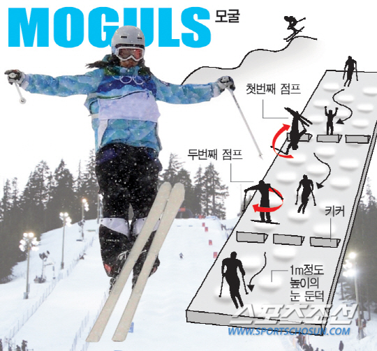 모굴은 가파른 코스에 쌓인 눈 둔덕을 빠져 나오며 두 차례 점프로 공중 묘기를 선보이는 경기다. 1m 정도 높이의 둔덕이 3∼4m 간격으로 펼쳐져 있는 코스를 내려오며 턴을 시도해야 한다. 또 코스 초반과 중반 이후 설치된 점프대에서 공중묘기를 펼친다. 에어리얼은 경사가 심한 주행 슬로프를 내려오다가 도약대를 이용해 공중으로 치솟아 기술을 펼치고 착지하는 종목으로, 점프할 때의 도약과 동작, 착지가 모두 점수에 반영된다. 스키크로스에서는 4∼5명이 한 조로 장애물들이 있는 코스를 질주하는 동안 점프 동작과 추월 경쟁을 펼치는데, 그만큼 위험하기도 해서 상대 선수를 밀거나 해 방해하면 실격된다. 스키 하프차이프는 스노보드 하프파이프의 스키 버전이다. 파이프를 반으로 자른 반원통형 모양의 슬로프를 타고 내려오면서 공중 묘기와 점프, 비틀기 등 기술을 뽐내는 경기다.
