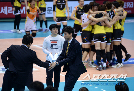 삼성화재와 러시앤캐시의 2013-2014 프로배구 경기가 9일 대전충무체육관에서 열렸다. 삼성화재를 3대0으로 꺾고 승리를 거둔 러시앤캐시 선수들이 기쁨을 나누고 있다. 김세진 감독이 삼성화재 신치용 감독과 악수를 나누고 있다. 대전=허상욱 기자 wook@sportschosun.com/2014.02.09/