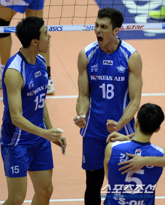 5일 아산 이순신체육관에서 배구 V리그 남자부 우리카드와 대한항공의 시즌 네 번째 경기가 열렸다. 우리카드는 올 시즌 3차례의 대한항공 전에서 전승을 거뒀다. 득점에 성공한 대한항공 마이클이 동료들과 함께 환호하고 있다. 아산=송정헌 기자 songs@sportschosun.com/2014.02.05
