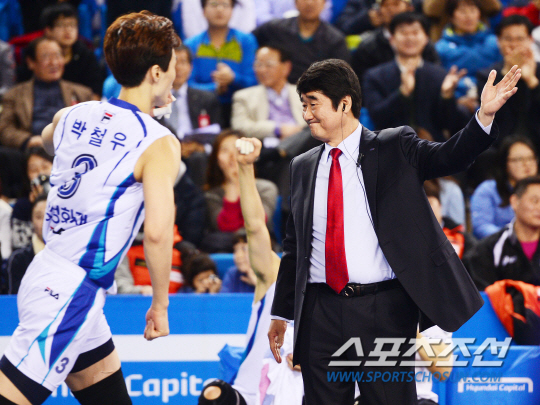 현대캐피탈과 삼성화재가 정규리그 우승컵을 놓고 마지막 대결을 펼쳤다. 9일 천안유관순체육관에서 2013-2014 프로배구 V리그 현대캐피탈과 삼성화재의 정규리그 마지막 맞대결 경기가 열렸다. 삼성화재 박철우가 공격을 성공시킨 후 환호하며 달려오자 신치용 감독이 오른손을 들어 환영하고 있다. 천안=정재근기자 cjg@sportschosun.com/2014.03.09/