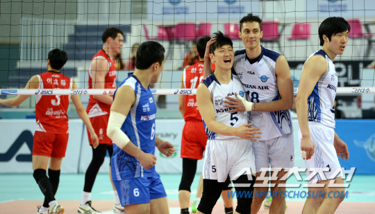 대한항공과 LIG 손해보험의 2013-2014 프로배구 경기가 11일 인천계양체육관에서 열렸다. 3-0 승리를 거둔 대한항공 선수들이 기쁨을 나누고 있다. 인천=허상욱 기자 wook@sportschosun.com