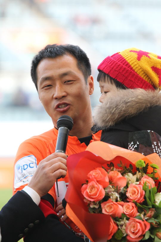 제주 유나이티드에도 원클럽맨이 있다. 화려하지 않지만 제주의 역사에 영원히 기억될 이름. '늘푸른 소나무' 한동진(35)이 바로 그 주인공이다. 한동진은 9일 제주월드컵경기장에서 열린 수원과의 개막전에서 현역 은퇴식을 가졌다. 그는 은퇴식에서 뜨거운 눈물을 흘렸다. 한동진은 "은퇴식이라고 하긴 했는데 아직 실감이 안난다. 운동장을 보면 다시 뛸 수 있을 것 같다"며 "사실 K-리그 챌린지팀으로 이적할 수 있는 상황이었지만 팀에서 나를 생각하는 마음이 크다는 것을 알았다. 2~3년 벤치에 있는 것보다 일찌감치 지도자로 나서 젊은 선수들을 육성하는게 나쁘지 않겠다 싶어서 결심했다"고 했다.