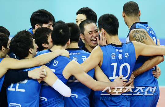 대한항공과 현대캐피탈이 23일 인천 계양체육관에서 2013-2014 프로배구 V리그 남자부 플레이오프 2차전을 벌였다. 세트스코어 3-1로 승리하며 2연승을 거두고 챔피언결정전에 진출한 현대캐피탈 선수들이 환호하고 있다. 인천=정재근기자 cjg@sportschosun.com/2014.03.23/ |