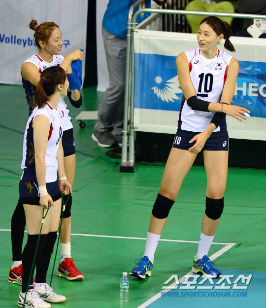 27일 인천 송림체육관에서 2014인천아시아경기대회 여자배구 대한민국과 홍콩의 8강전 경기가 열렸다. 한수 아래 홍콩을 상대로 선발 출전하지 않은 김연경(오른쪽)이 대기석에에서 동료들과 밝은 표정으로 대화를 나누고 있다.