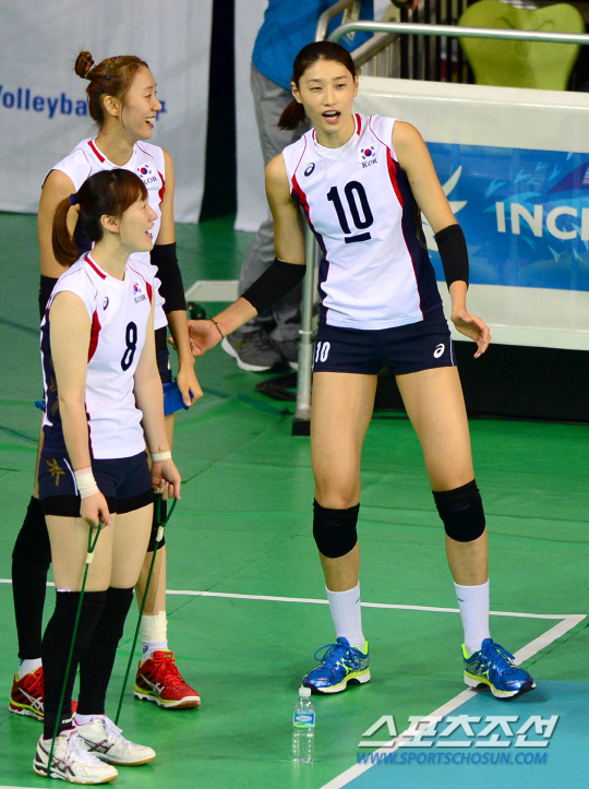 27일 인천 송림체육관에서 2014인천아시아경기대회 여자배구 대한민국과 홍콩의 8강전 경기가 열렸다. 한수 아래 홍콩을 상대로 선발 출전하지 않은 김연경(오른쪽)이 대기석에에서 동료들과 밝은 표정으로 대화를 나누고 있다.