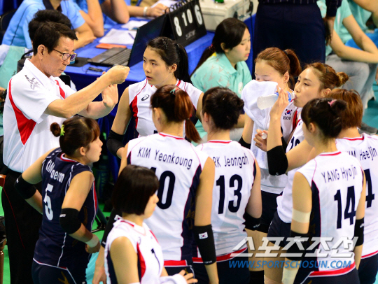 27일 인천 송림체육관에서 2014인천아시아경기대회 여자배구 대한민국과 홍콩의 8강전 경기가 열렸다. 한수 아래 홍콩을 상대로 대표팀 이선구 감독(왼쪽)이 선수들에게 작전을 전달하고 있다.