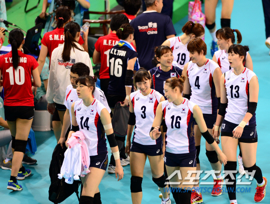 27일 인천 송림체육관에서 2014인천아시아경기대회 여자배구 대한민국과 홍콩의 8강전 경기가 열렸다. 대표팀이 한 수 아래 홍콩을 상대로 세트스코어 3대0 완벽한 승리를 거뒀다. 코트를 이동하고 있는 선수들.