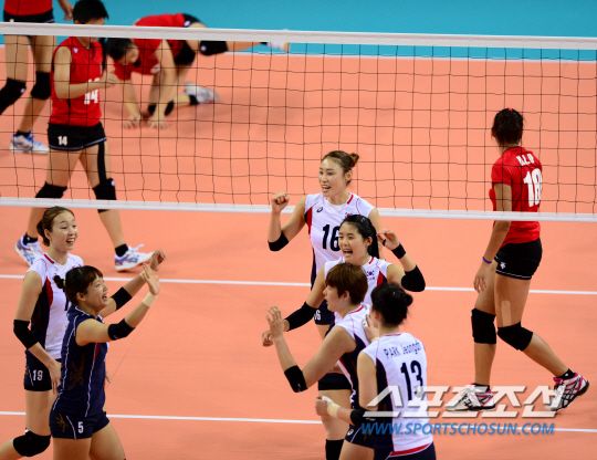 27일 인천 송림체육관에서 2014인천아시아경기대회 여자배구 대한민국과 홍콩의 8강전 경기가 열렸다. 대표팀이 한 수 아래 홍콩을 상대로 세트스코어 3대0 완벽한 승리를 거뒀다. 득점에 성공하고 기뻐하는 선수들.