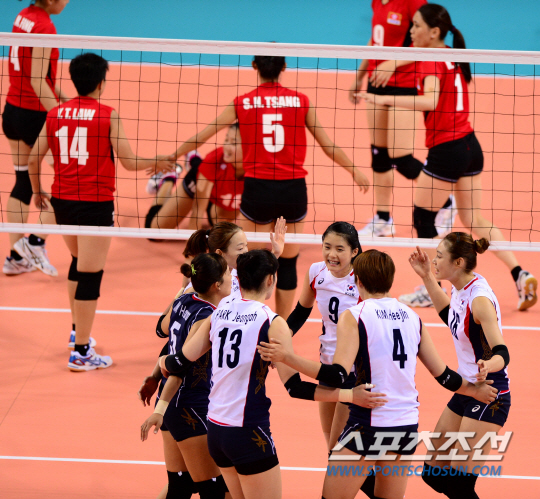 27일 인천 송림체육관에서 2014인천아시아경기대회 여자배구 대한민국과 홍콩의 8강전 경기가 열렸다. 대표팀이 한 수 아래 홍콩을 상대로 세트스코어 3대0 완벽한 승리를 거뒀다. 득점에 성공하고 기뻐하는 선수들.