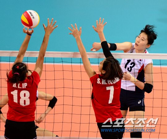 27일 인천 송림체육관에서 2014인천아시아경기대회 여자배구 대한민국과 홍콩의 8강전 경기가 열렸다. 대표팀이 한 수 아래 홍콩을 상대로 세트스코어 3대0 완벽한 승리를 거뒀다. 박정아(오른쪽)가 홍콩 선수들의 블로킹을 앞에 두고 스파이크를 날리고 있다.
