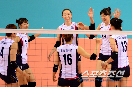 27일 인천 송림체육관에서 2014인천아시아경기대회 여자배구 대한민국과 홍콩의 8강전 경기가 열렸다. 대표팀이 한 수 아래 홍콩을 상대로 세트스코어 3대0 완벽한 승리를 거뒀다. 득점에 성공한 대표팀 선수들이 기뻐하고 있다.