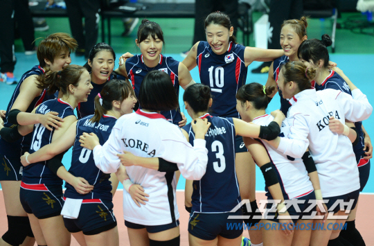 인천아시안게임 여자배구 한구과 일본의 준결승전이 30일 안산 상록수체육관에서 열렸다. 한국이 일본을 3-0으로 꺾으며 결승에 진출한 가운데 김연경이 동료들과 어깨동무를 한 채 기쁨을 만끽하고 있다.