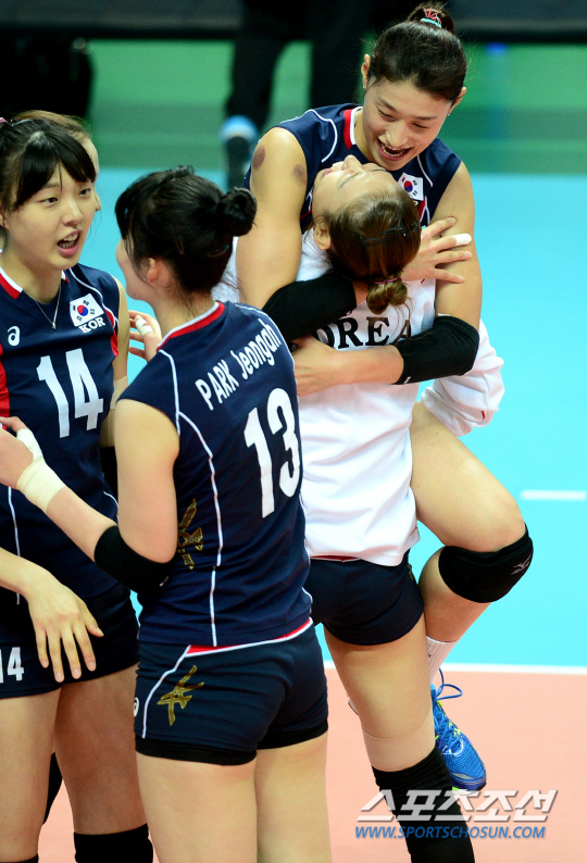 인천아시안게임 여자배구 한구과 일본의 준결승전이 30일 안산 상록수체육관에서 열렸다. 한국이 일본을 3-0으로 꺾으며 결승에 진출한 가운데 김연경이 동료들과 어깨동무를 한 채 기쁨을 만끽하고 있다.