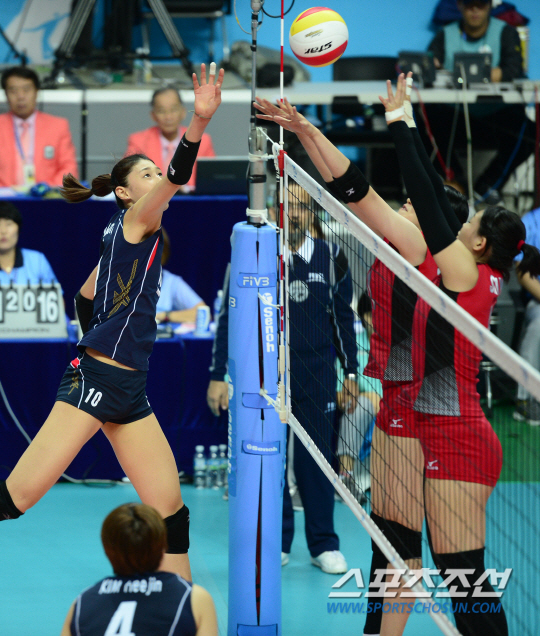 인천아시안게임 여자배구 한구과 일본의 준결승전이 30일 안산 상록수체육관에서 열렸다. 한국 김연경이 연타공격을 성공시키고 있다.