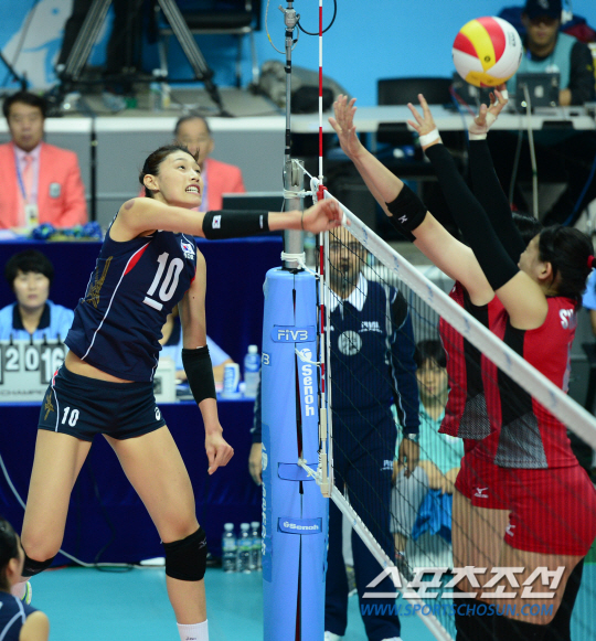 인천아시안게임 여자배구 한구과 일본의 준결승전이 30일 안산 상록수체육관에서 열렸다. 한국 김연경이 강력한 스파이크 공격을 시도하고 있다.