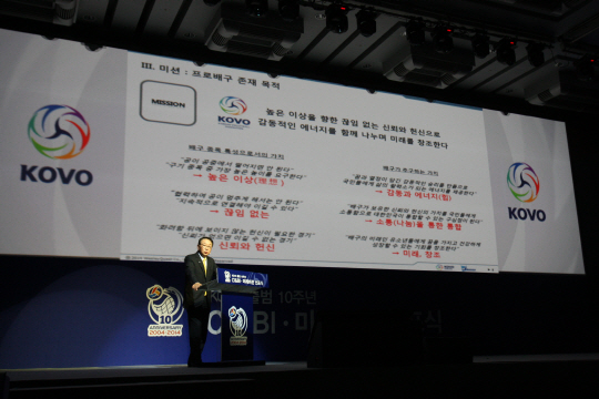 KOVO는 13일 서울 홍은동 그랜드힐튼호텔 컨벤션센터에서 'KOVO출범 10주년 CI(기업이미지) & BI(브랜드이미지) 미래비전 선포식'을 열었다. 이 자리에서 KOVO는 출범 10주년을 자축하고 향후 10년간 또 한번의 도약을 다짐했다.
