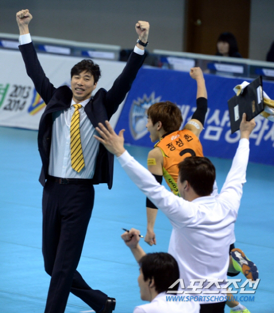 김세진 OK저축은행 감독이 지난 시즌 삼성화재를 3대0으로 꺾은 뒤 환호하고 있다. 대전=허상욱 기자 wook@sportschosun.com/2014.02.09/