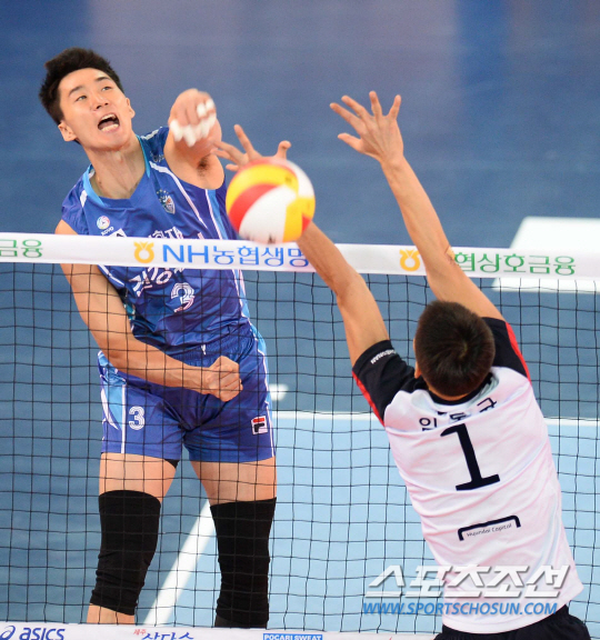 2014-2015 프로배구 V리그 현대캐피탈과 삼성화재의 경기가 16일 천안유관순체육관에서 열렸다. 삼성화재 박철우가 현대캐피탈 임동규의 블로킹 사이로 스파이크를 강타하고 있다. 천안=최문영 기자 deer@sportschosun.com /2014.11.16/
