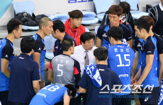2014-2015 프로배구 V리그 대한항공과 현대캐피탈의 경기가 23일 인천계양체육관에서 열렸다. 현대캐피탈 김호철 감독이 문성민에게 작전지시를 내리고 있다. 인천=최문영 기자 deer@sportschosun.com /2014.11.23/