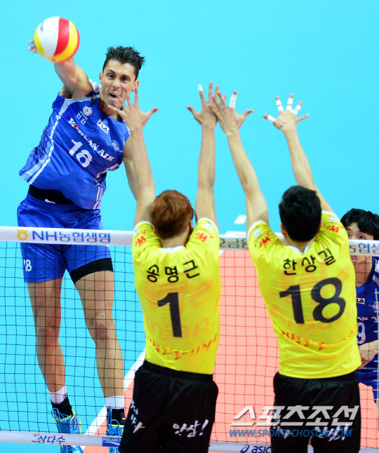 13일 안산 상록수체육관에서 배구 V리그 남자부 OK저축은행과 대한항공의 경기가 열렸다. 대한항공 산체스가 OK저축은행 선수들의 블로킹을 앞에 두고 스파이크를 날리고 있다. 안산=송정헌 기자 songs@sportschosun.com/2014.11.13 |