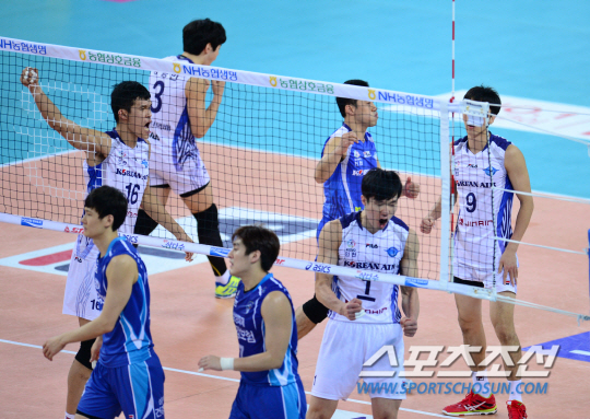 7일 오후 인천 계양체육관에서 2014-2015 V리그 삼성화재와 대한항공의 경기가 열렸다. 1세트에 이어 2세트로 승리한 대한항공 선수들이 환호하고 있다. 인천=김경민 기자 kyungmin@sportschosun.com/2014.12.07.