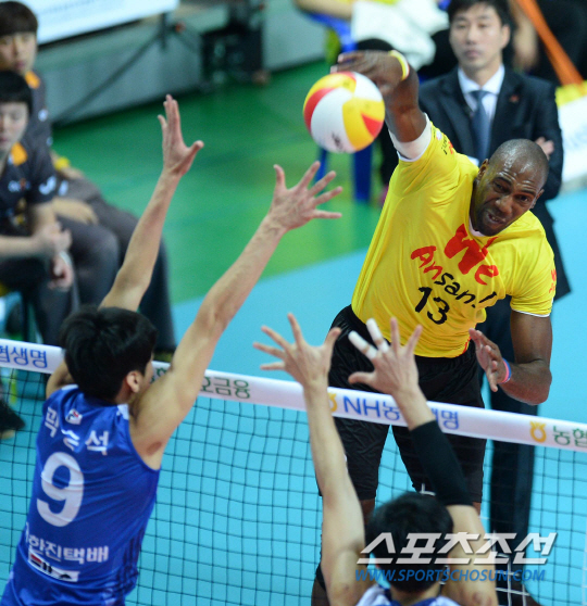 OK저축은행은 20일 안산 상록수체육관에서 열린 NH농협 3014~2015시즌 프로배구 V리그 남자부 홈경기에서 우리카드에 3대2(16-25 23-25 25-14 25-20 15-10) 역전승을 거뒀다.