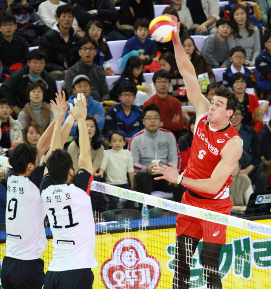 LIG손해보험은 21일 천안 유관순체육관에서 벌어진 현대캐피탈과의 2014~2015시즌 NH농협 V리그 3라운드 경기에서 풀세트 접전 끝에 세트스코어 3대2(34-32, 21-25, 24-26, 25-17, 16-14)로 승리를 거뒀다.