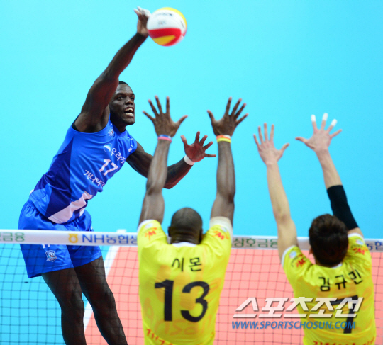 17일 오후 안산 상록수체육관에서 2014-2015 V리그 우리카드와 OK저축은행의 경기가 열렸다. 우리카드 까메호가 OK저축은행 시몬과 김규민의 블로킹을 넘어 스파이크 공격을 시도하고 있다. 안산=김경민 기자 kyungmin@sportschosun.com
