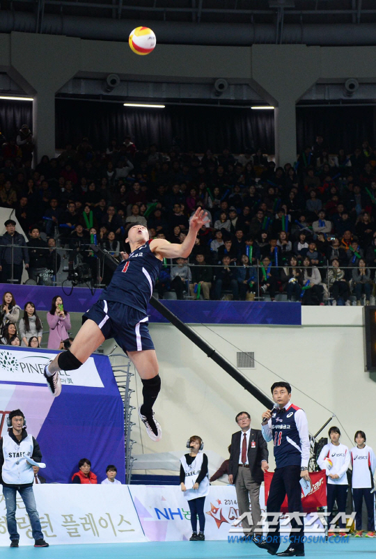 전광인이 25일 장충체육관에서 펼쳐진 프로배구 별들의 잔치인 "2014-2015 V리그 올스타전" 스파이크 서브 킹 선발대회에서 총알 스파이크를 선보이고 있다.. 이번 올스타전은 2년 8개월간의 리모델링 공사를 마치고 새 얼굴로 돌아온 장충체육관에서 프로배구의 새로운 시작이라는 'Re-START Back to the base'컨셉트로 마련됐다. K-스타 팀(남자부 삼성화재, 대한항공, LIG손해보험 / 여자부 GS칼텍스, KGC인삼공사, 현대건설)과 V-스타 팀(남자부 현대캐피탈, 우리카드, OK저축은행, 한국전력 / 여자부 IBK기업은행, 한국도로공사, 흥국생명)의 한마당 축제가 펼쳐진다. 장충체육관=최문영 기자 deer@sportschosun.com