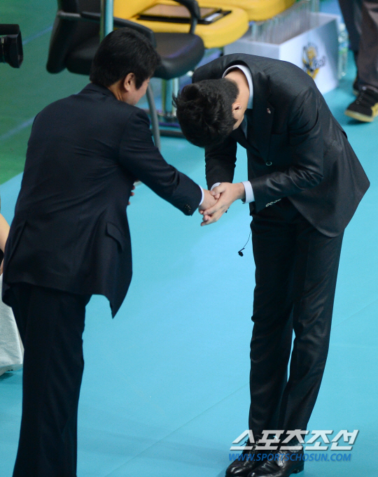 30일 안산 상록수체육관에서 배구 V리그 남자부 OK저축은행과 삼성화재의 경기가 열렸다. 14승 4패로 시즌 1위를 달리고 있는 삼성화재와 13승 5패로 2위를 기록 중인 OK저축은행의 경기다. 경기 전 OK저축은행 김세진 감독이 삼성화재 신치용 감독(왼쪽)을 찾아 악수를 나누고 있다. 안산=송정헌 기자 songs@sportschosun.com/2014.12.30 |