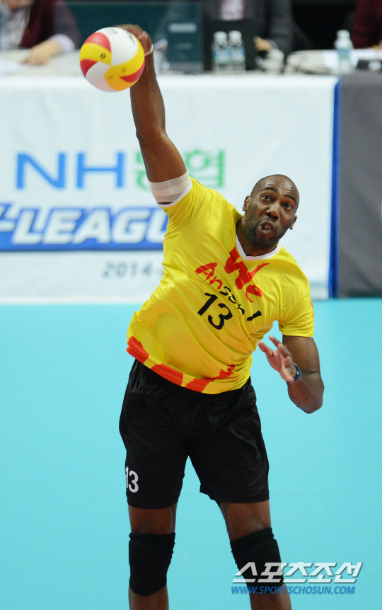 OK저축은행과 LIG손해보험의 2014-2015 프로배구 V리그 경기가 8일 안산상록수체육관에서 열렸다. OK 저축은행 시몬이 강력한 스파이크 서브를 넣고 있다. 안산=정재근 기자 cjg@sportschosun.com/2015.01.08/