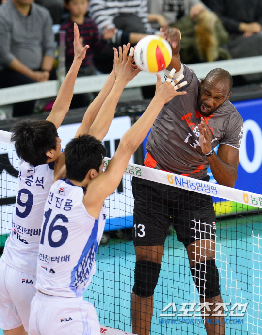 2014-2015 프로배구 V리그 대한항공과 OK저축은행의 경기가 13일 인천계양체육관에서 열렸다. OK저축은행 시몬이 대한항공 곽승석, 전진용의 블로킹사이로 스파이크를 강타하고 있다. 인천=최문영 기자 deer@sportschosun.com /2015.01.13/ |