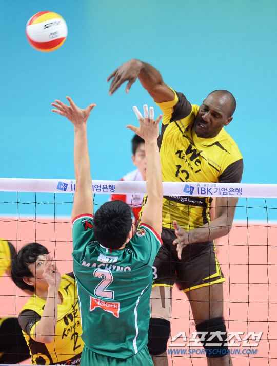2015 한일 V리그 탑매치 한국의 OK저축은행과 일본 JT선더스의 경기가 12일 서울장충체육관에서 열렸다. OK저축은행 시몬이 JT선더스 마치노의 블로킹 사이로 스파이크를 강타하고 있다. 2006년부터 총 5차례 개최된 한일 V리그 탑매치는 양국간 배구교류및 국제 경쟁력 제고를 위한 대회로 자리잡았으며 2010년 부터는 1위팀만 참가해 한일 프로배구의 최강자를 가린다. 장충체=최문영 기자 deer@sportschosun.com /2015.04.12/