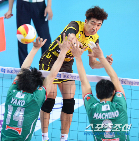 2015 한일 V리그 탑매치 한국의 OK저축은행과 일본 JT선더스의 경기가 12일 서울장충체육관에서 열렸다. OK저축은행 강영준이 JT선더스 야코, 마치노의 블로킹 사이로 스파이크를 강타하고 있다. 2006년부터 총 5차례 개최된 한일 V리그 탑매치는 양국간 배구교류및 국제 경쟁력 제고를 위한 대회로 자리잡았으며 2010년 부터는 1위팀만 참가해 한일 프로배구의 최강자를 가린다. 장충체=최문영 기자 deer@sportschosun.com /2015.04.12/