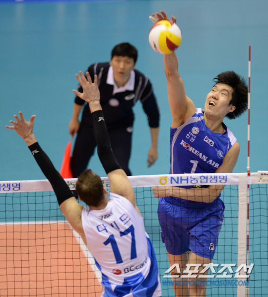 우리카드와 대한항공의 2014-2015 프로배구 V리그 경기가 1일 아산 이순신체육관에서 열렸다. 대한항공 신영수가 우리카드 다비드의 블로킹 앞에서 스파이크 공격을 하고 있다. 아산=정재근 기자 cjg@sportschosun.com