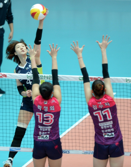 현대건설은 17일 충북 청주실내체육관에서 열린 2015년 청주·KOVO컵 여자부 4강전에서 흥국생명을 세트스코어 3대1(25-20 26-24 12-25 25-23)로 꺾고 결승에 진출했다. 지난해 이 대회 정상에 오른 현대건설은 18일 IBK기업은행-KGC인삼공사전의 승자와 결승전을 치른다.