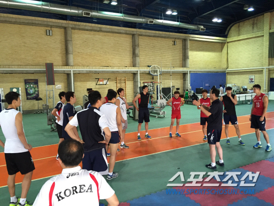 ◇남자 배구 대표팀 선수단이 28일(한국시각) 이란 테헤란올림픽위원회 체윤관에서 웨이트 트레이닝 실시에 앞서 미팅을 갖고 있다. 테헤란(이란)=김진회 기자 manu35@sportschosun.com