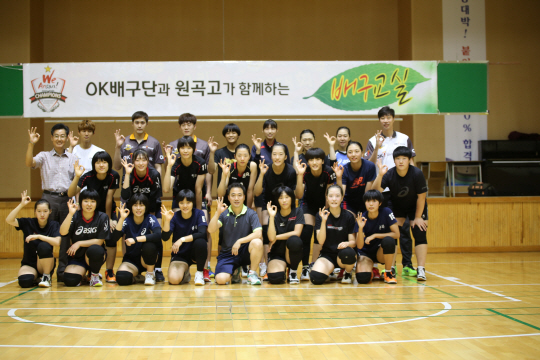 프로배구 OK저축은행이 안산 지역 엘리트 배구단과 유소년 배구단을 위한 순회 일일코칭 행사를 진행하고 있다.