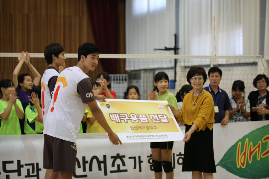 지난 26일에는 송명근 이민규가 안산서초를 방문했다. 27일에는 송희채 심경섭 배홍희 그리고 김세진 감독이 원곡고를 찾아 함께 훈련과 미니게임을 소화하며 즐거운 시간을 보냈다. 28일에는 강영준 등이 원곡중을 방문했다.